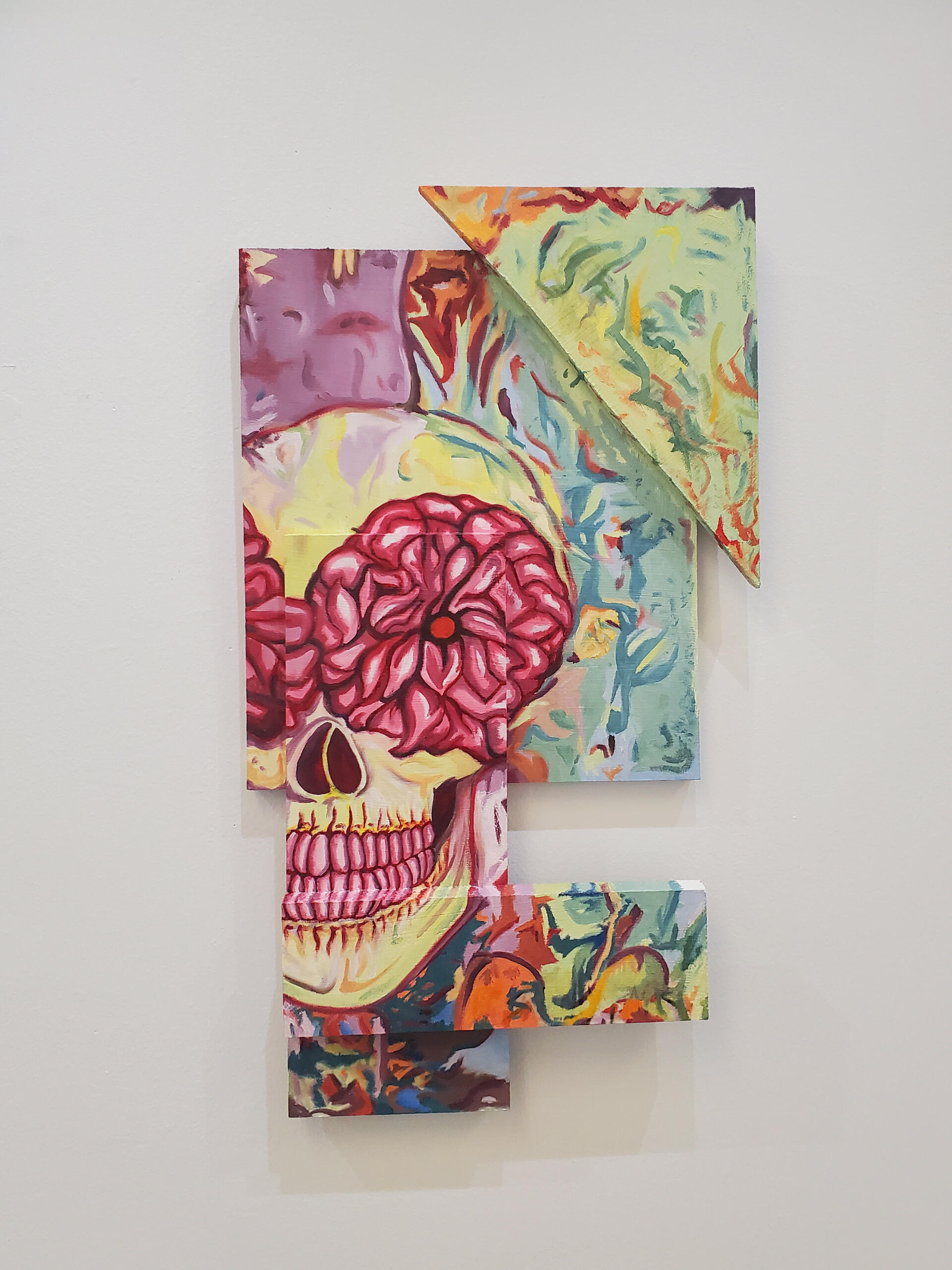 The duty of the artist is to be truthful to the manner in which ideas feel, not the way they look. Pulling from influences such as Ernst Ludwig Kirchner and Hannah Höch, I seek to ignore the natural appearance of subjects in order to provide new presence for what I portray. My style can be described as Expressionistic in nature, filled with instances of maximalism, realistic imagery coupled with non-representational colors, and raw brushstrokes. It is my belief that within these qualities, restless strength can be showcased.On my best days, you can find me exploring the unfortunate rise of 21st-century authoritarianism, a sense of nostalgia for unpromised futures, social upheaval, and the curse of news overexposure. On the other hand, my media includes both traditional and digital painting alike. It can be found to have parallels with the work of contemporary artists such as Cecily Brown and Lizzy Lunday.In my BFA thesis work, “Impending Unrest,” I strive to depict the tension inherent to the issues of our present time from an emotional and non-straightforward perspective. It does not wish to allude to specific problems but to the strain of experiencing said problems through the primitive application of color, as well as flower and skull motifs.Contrary to popular belief, I do have a heart.WORKS1. He Who Is Not Afraid, Enters a House in Flames, 2023, oil on wood, 17" × 19" × 2"