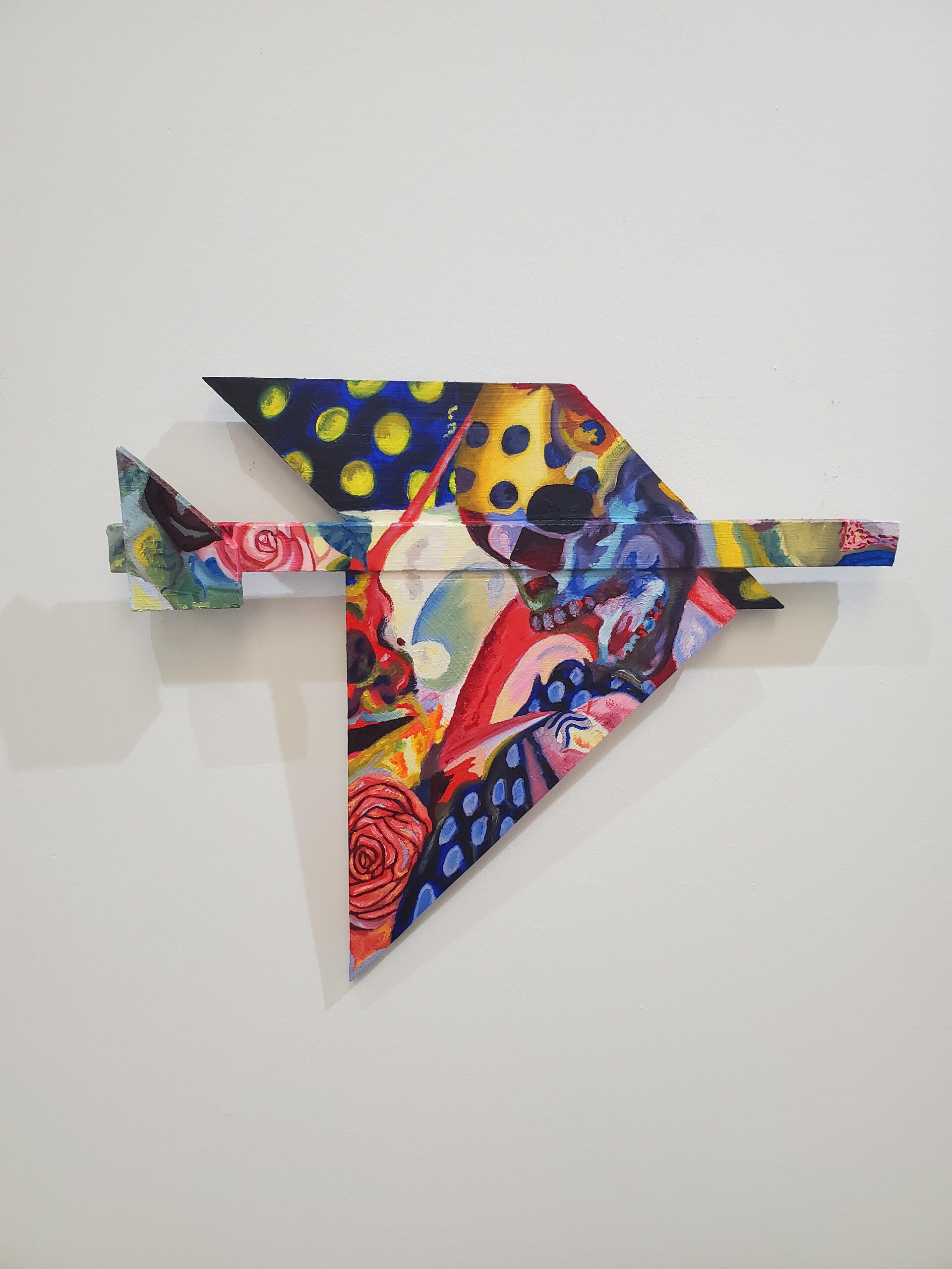 I never understood those who described art as an outlet to escape from the world. As I listened and tried to please those around me to remove certain aspects of my work or add additional flairs or criticism that had no value to me, I eventually realized this was not something I created or could call my own. I could not form any connection to the works I created and trashed them aside like nothing.Others would describe my work as figurative journaling; rather than escaping the world, I compile my life into a visual format for my own reflection. I was driven to live a life of spontaneous decisions, and I’m constantly running, unaware of my destination in fear of control and restraint. My works are fabrications of my life in order to ground myself and value my upbringing and meaning as an artist and person.My works fluctuate between feelings of imprisonment and freedom. The characters I portray are creations made with a specific purpose in life or they are left abandoned to fend for themselves. These stories are windows into my own life—fables of my memories, fairytales of my experiences, and reflections of choices I have made that lead me to the path I’m currently traveling. When I create a character, they are a part of my persona. They wander through my path with different situations and obstacles. I wonder if they would commit to the same choices I made or take the route I did not. My stories answer my curious “what if’s” that keep me awake. In the end, there is always a goal in my art to express a feeling of either freedom or imprisonment, happiness or misery, and control or chaos.WORKPsyche’s Puppets, 2023, installation, digital print on canvas, sculpture, four 18" × 24" paintings, 14" dolls, 41" × 26" stage display