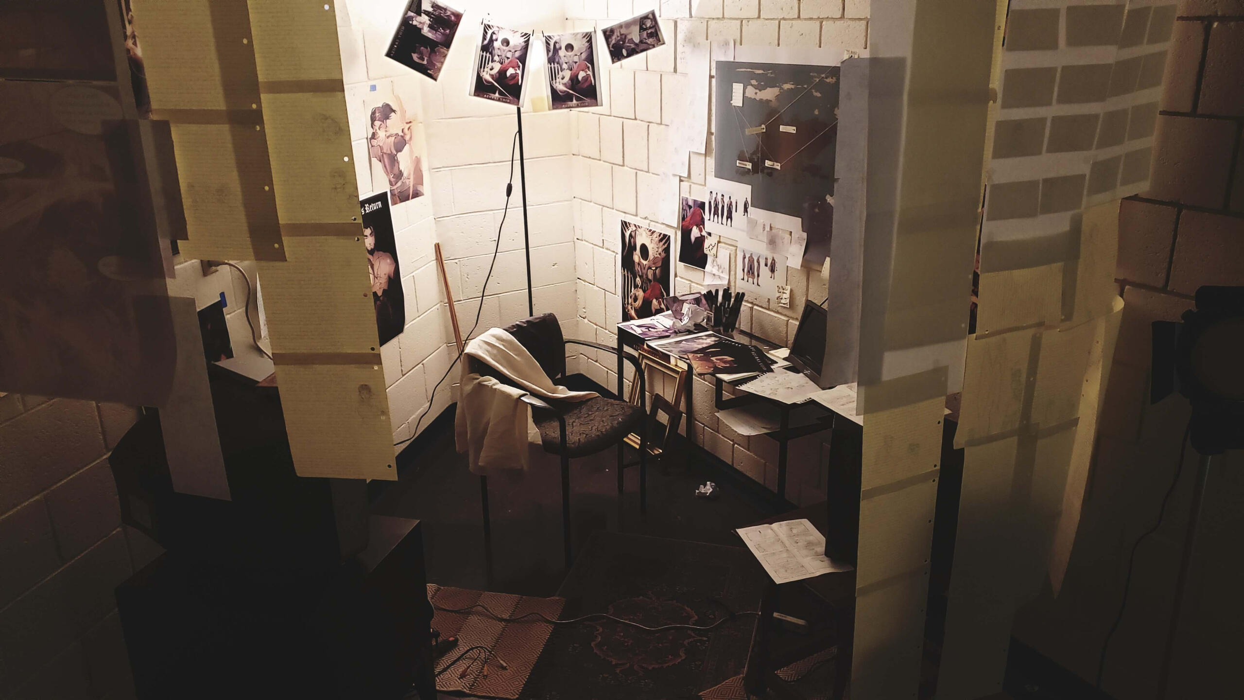 Psyche’s Puppets, 2023, installation, digital print on canvas, sculpture, four 18" × 24" paintings, 14" dolls, 41" × 26" stage display