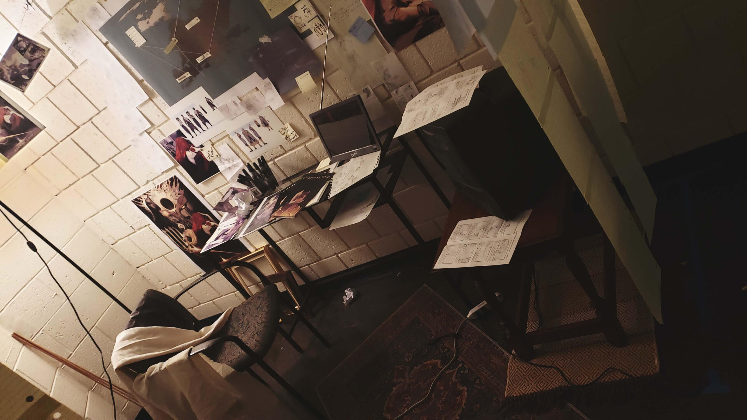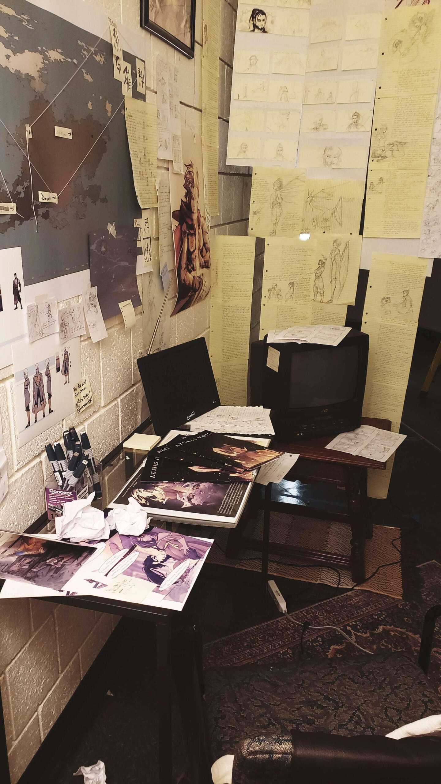 In my journey to tell The Fifth Era story, I became infatuated with concept work and the process of how an artist thinks and builds their world. I decided to tell the story of 3 characters. Jovan, Azura, and Raphael. Each character tells the same story but from their perspective, and as you travel from one character to the next, looking at the notes scattered on the maker's desk, you gain more knowledge of the world and how it was made.The first story I will present is Azura’s Void told in the form of a graphic novel. My decision for this came with the memories of my youth, dreaming of making my own world instead of being forced to become infatuated with someone else’s. This story depicts the reality of their world and how someone can fall victim to deception and jealousy.The next story that follows is Jovan and the Silver King, and I will be depicting it in the form of a retro-style, 8-bit video game play-through. You will follow Jovan, a young man chosen to be a heroic figure, as the Silver King uses him to politically manipulate the land and its people. His struggles as a young man to keep his fiancé safe from racial injustices contradict his actions when following the King’s command.Lastly will be the story of Raphael, the husband of Azura. This part of the story will be presented as an animation, showing a revenge-driven man who has lost everything they love and hold dear. His mission is to find this Golden knight (Jovan) and bring him to justice for killing his family and burning his village to the ground for false accusations. During their fight, Raphael is defeated after promising to even his wife and unborn son, later to be resurrected by his beloved wife, who was banished to the realm of the dead.All of this is presented through my work, papers, and notes scattered about—showing the viewer what it took to get where I am. I find beauty in the sketches and scribbles. Sharing what led to the final product is always a fascinating and a rare experience for the audience.WORKThe Fifth Era, 2023, mixed digital media installation, dimensions variable (several views)