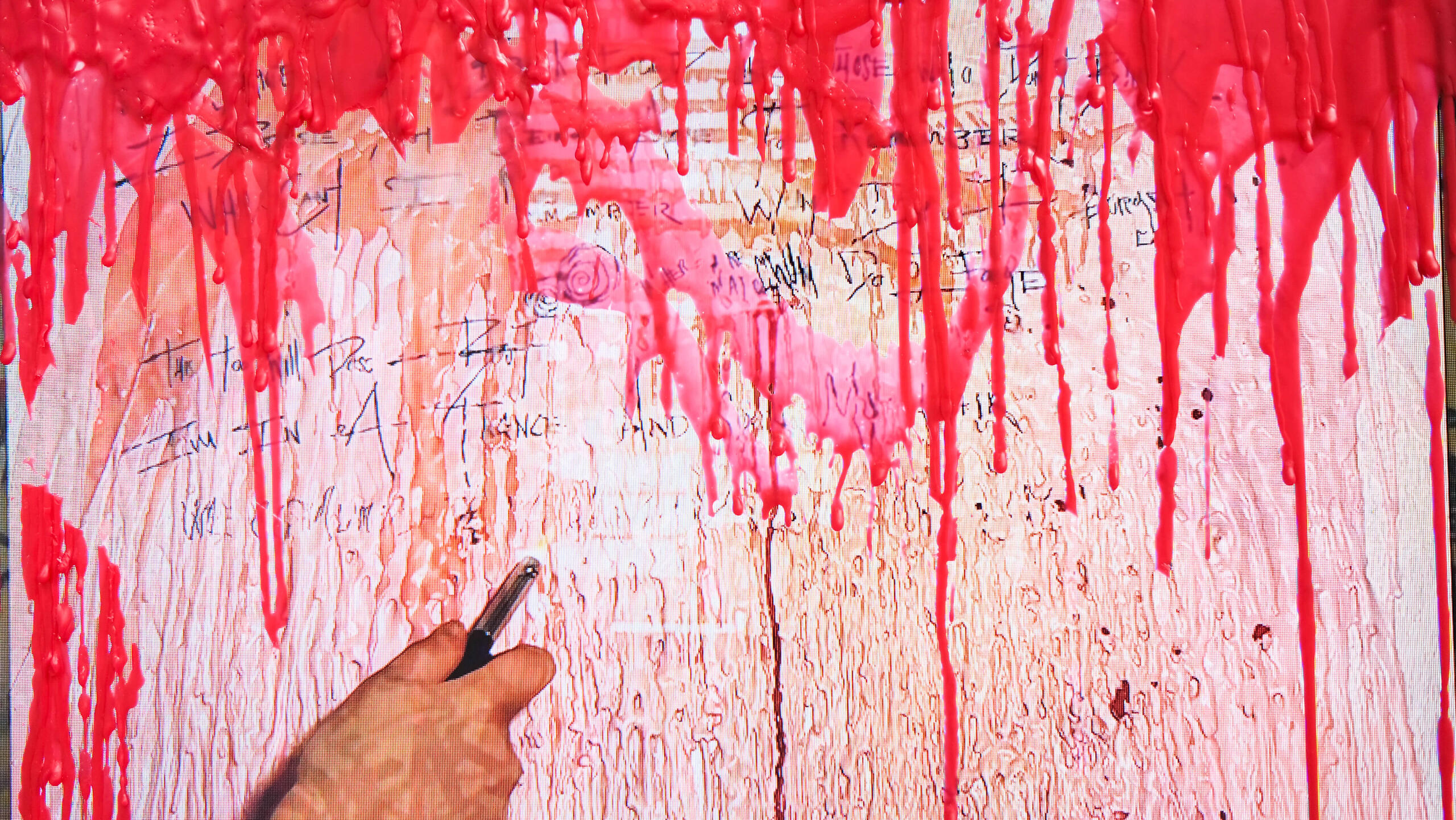 Distorting a video to then remove the distortion and reveal the video once again.Pouring candle wax on a written-on slab of wood to then remove the wax and reveal the writing once again.I am intrigued by how things can morph into entirely new and then revert to how they once were, solidifying the notion that almost nothing is certain.WORKS1. Red and Blue, 2023, wax, ink, and acrylic on wood, 24" × 21"
