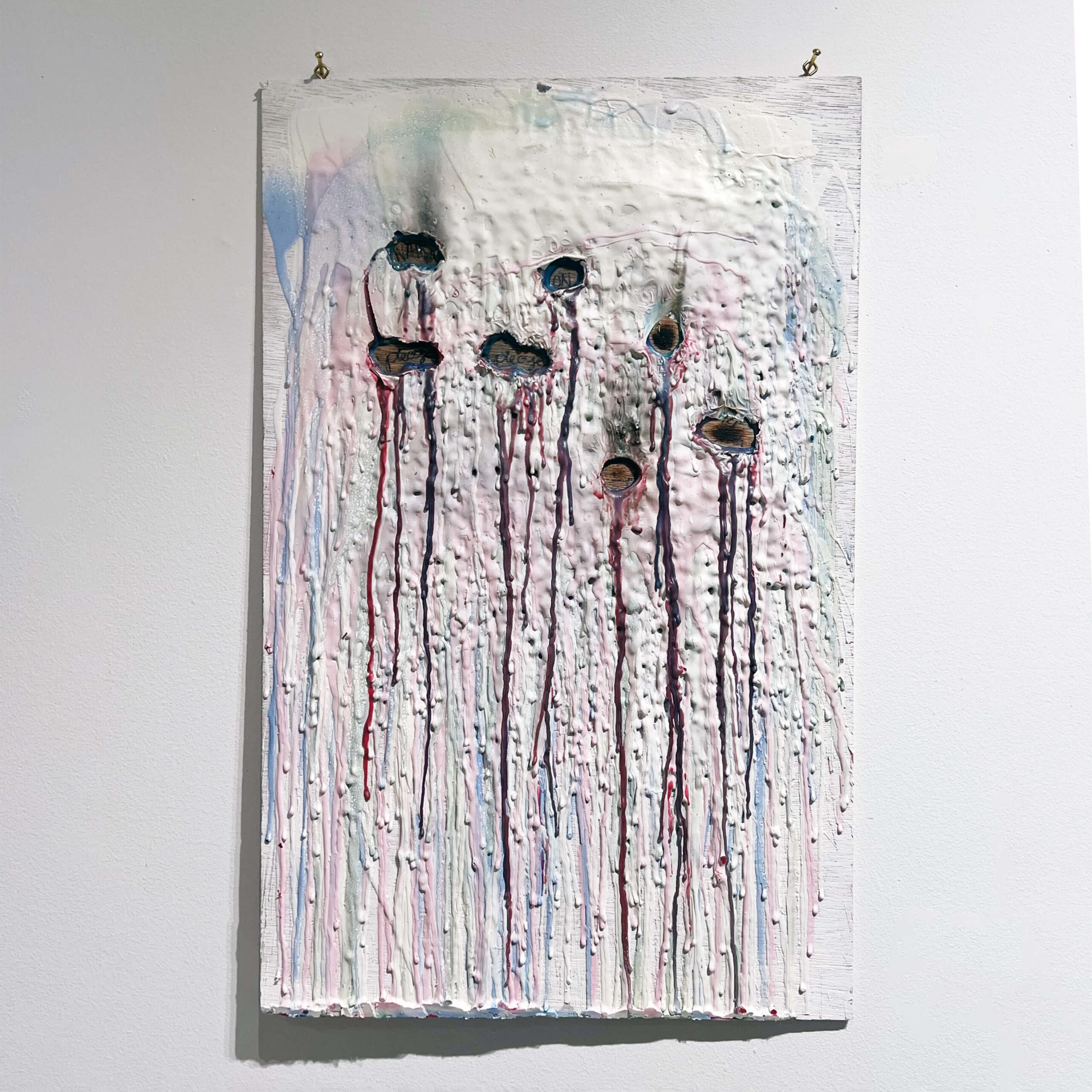 Walk on Please, please, 2023, wax, ink, acrylic on wood, 23" × 14"Ashley Gonzalez