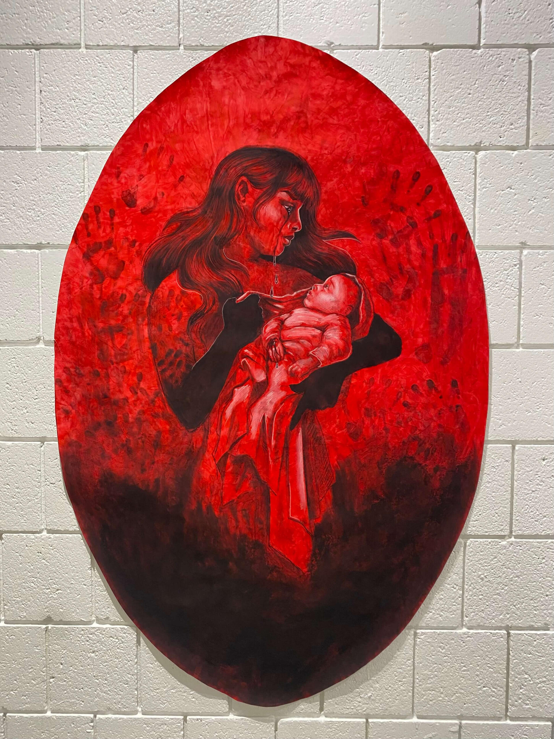 My work aims to visualize personal experiences in a style that reflects the impact of my deep-rooted issues on myself. This can range anywhere from representing past relationships to current anxieties, with the common thread being some tie to my own experiences. These works also have a common thread of being drawn on red-stained surfaces (paper or wood) with white and black charcoal. This color combination captures the boldness that I often go for with these themes, as the imagery I use often reads as disturbing, sometimes leaning more towards horrific art, similar to works such as Study after Velázquez’s Portrait of Pope Innocent X by Francis Bacon. Prints from Francisco Goya are also often an inspiration for this stylistic approach.Many of the themes I explore stem from issues that have long been pushed down or aside, giving reason to how heavily they influence my conscience and, more so, how disturbing they appear when visualized. Mental health and interpersonal relationships are some of the main subjects I focus on, such as social anxiety, depression, self-doubt, codependency, and harmful relationships with my parents. These concepts weigh heavy on my mind, so as I materialize them into physical representations, they become beastly and intimidating, mirroring that weight. These subjects are often accompanied in my work by drawn motifs of frames, taking influence from Alphonse Mucha, who utilizes frames and ornamentation in a more decorative fashion. I’ve been experimenting with the concept of using the frame as more than a device to contain artwork, and instead incorporating it into the work itself and allowing it to represent a sort of subconscious realm.In pieces such as Open Door, I focus on creating a separate world on the inside of these frames, with that world containing ghoulish creatures with animal skull heads meant to represent some of the darker parts of my mind. Figures within the frame, meant to represent me and/or other people in my life, interact with that frame by existing inside and outside of it at the same time, reaching out or even stepping outside of the frame. This is meant to represent how the subconscious impacts my actions in the real world and how I am always tied to it. The creatures within the frame cannot exist outside of it, just as my intrusive thoughts cannot exist outside of my mind. With that being said, this doesn’t stop the creatures from having a physical hold or influence on me and impacting my actions outside of the “frame,” just as my thoughts continuously influence my actions in the real world.WORKS1. Mother’s Touch pt. 1, 2023, black and white charcoal on red stained paper, 36" × 56"